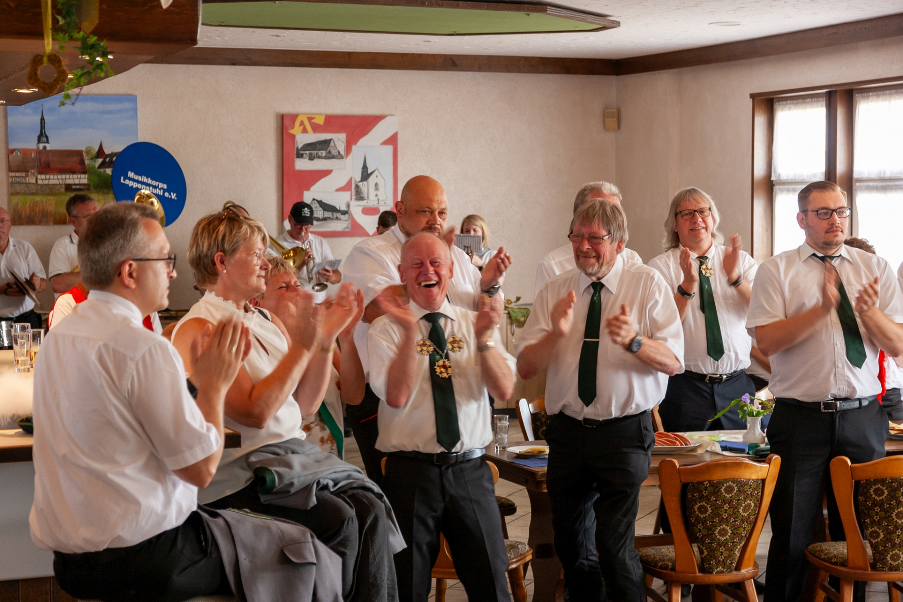 Gegen 15:45 h trafen die neuen Majestäten am Festplatz ein. Begleitet wurden sie von dem Musikkorps Lappenstuhl, der die Majestäten und Mitglieder ins Festzelt leitete.