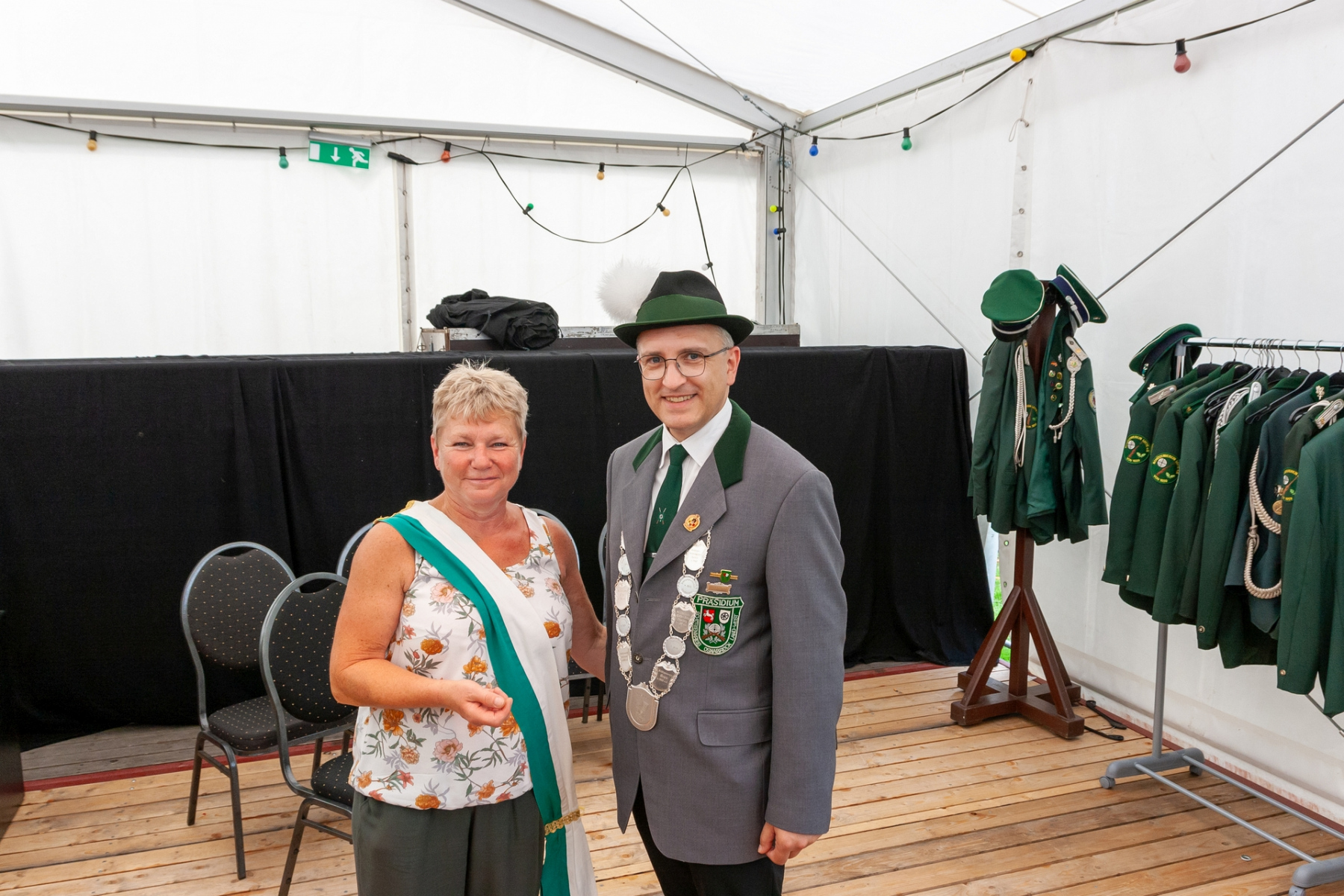 Nachdem Dominik Niederbrüning durch Armin Sünnewie die Königskette und dem restlichen Hofstaat die Insignien abgenommen worden waren, bekam Dominik und Jaqueline für das Königsjahr 2022 ihre Plaketten angesteckt. Dann folgte auf dem alten Hofstaat ein dreifaches Horrido.